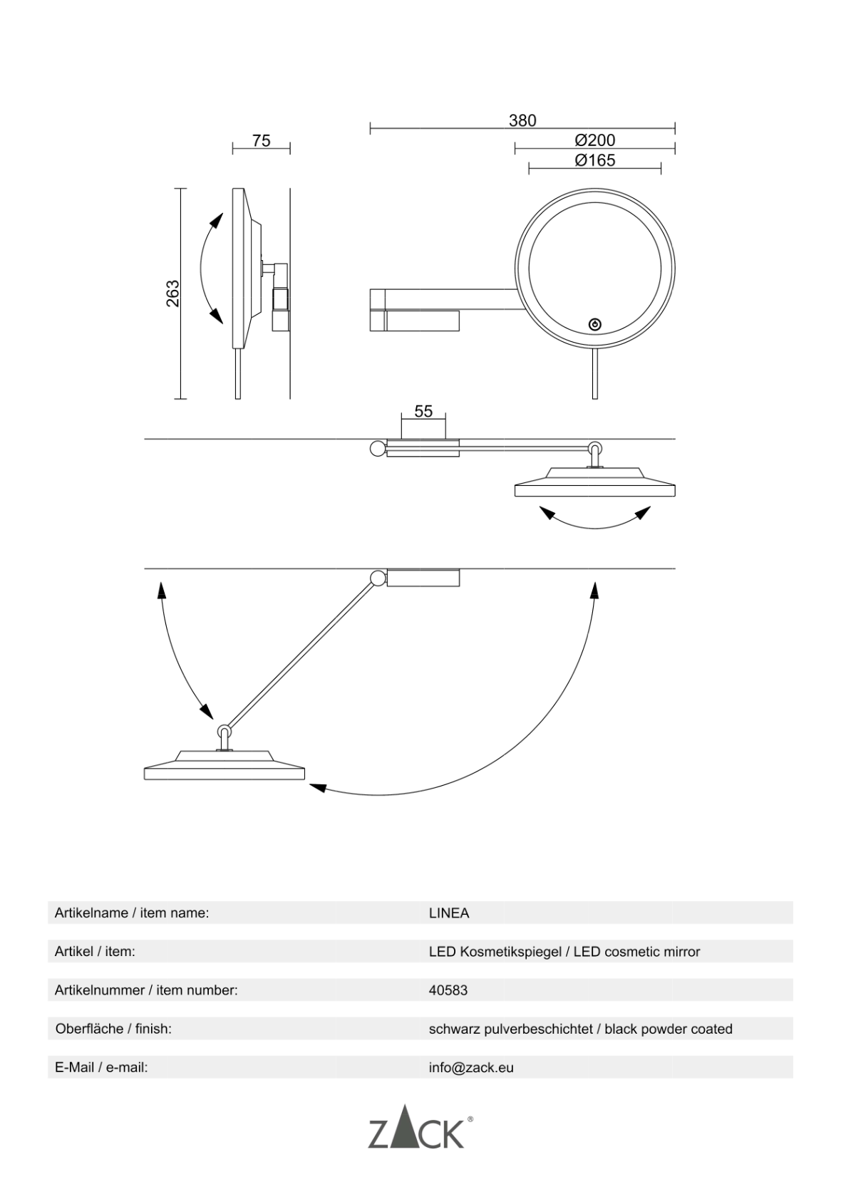 - Wide range of mirror adjustment options thanks to large articulated arm and flexible ball joint directly on the mirror