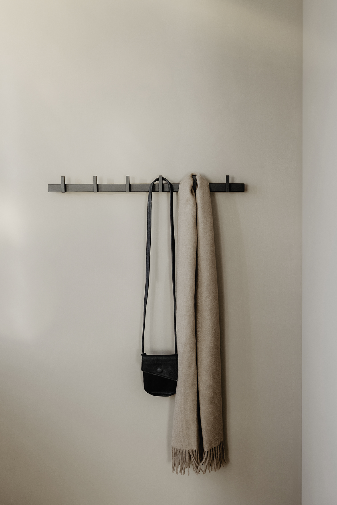 Elegant, timeless coat rack with 6 hooks in a free-floating look. Jackets and accessories such as hats, scarves and shawls can be placed over the hooks or hung with a hanger.