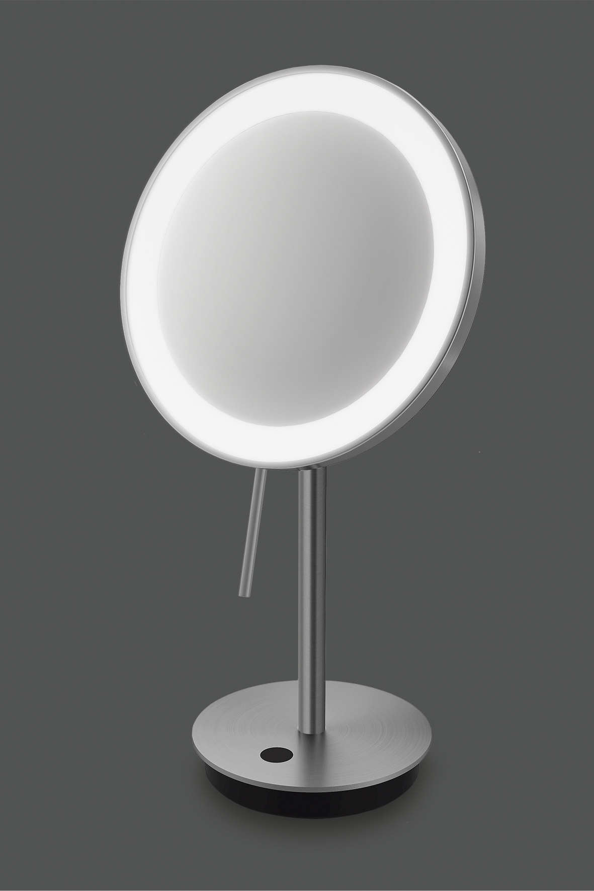Grâce au grossissement x 5, même les petits détails sont clairement visibles lors du maquillage ou du rasage, et la surface du miroir peut être réglée en continu pour un angle de vue optimal grâce à une articulation située à l’arrière. L’éclairage complet à diodes électroluminescentes (LED) fournit une lumière uniforme et sans ombre dans une agréable couleur blanc lumière du jour.