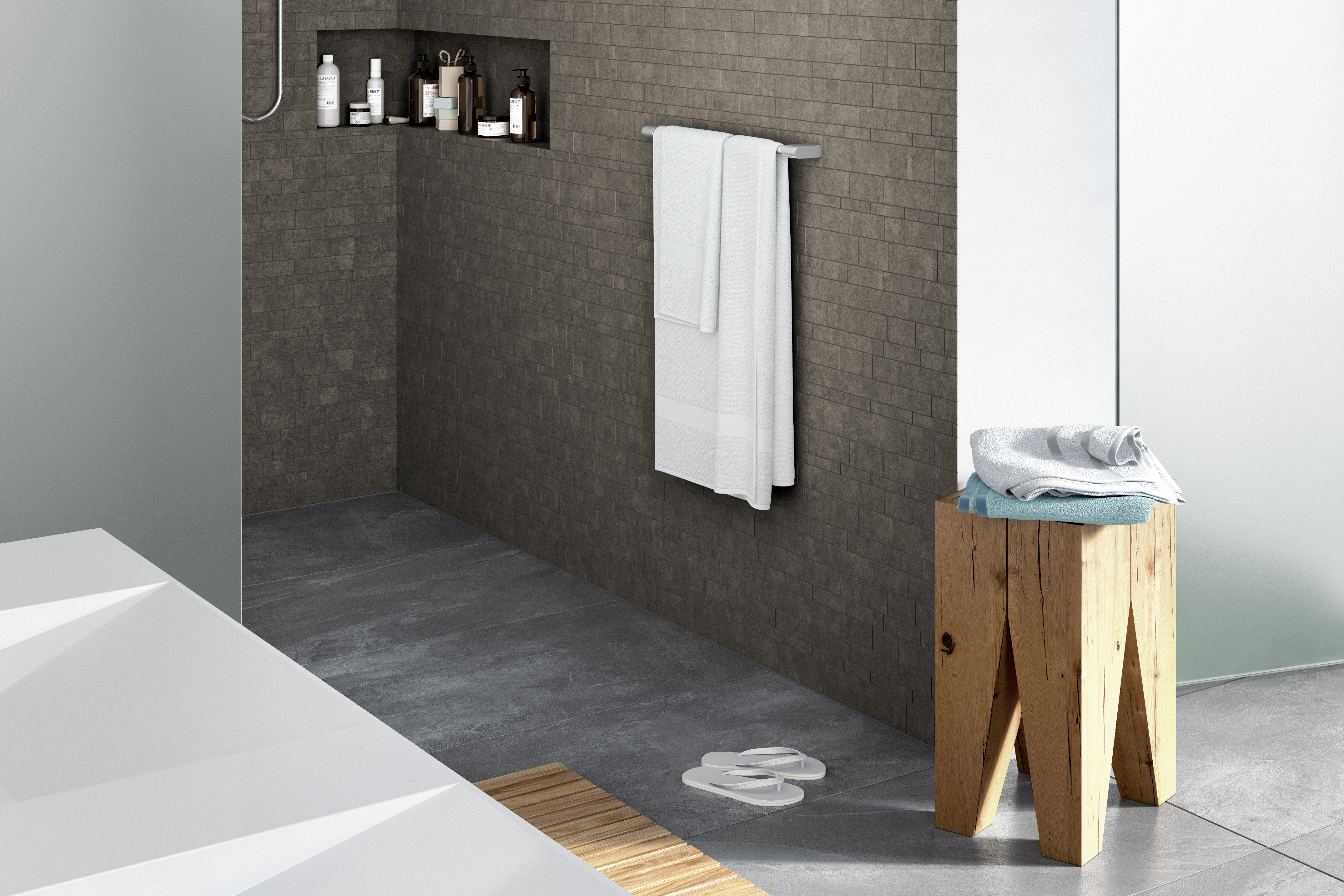 Faites de vos serviettes un élément décoratif qui attire l’attention – accrochées sur le porte-serviettes, elles sont toujours à portée de main. Après utilisation, la distance au mur offre un espace suffisant pour le séchage.