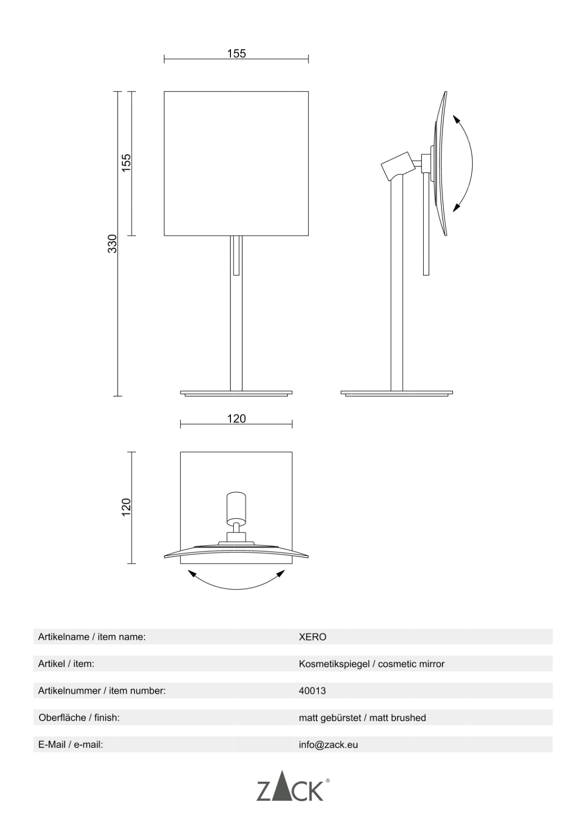 De frameloze XERO staande spiegel is een briljante hulp in de badkamer. Dankzij de vergroting van 5x zijn zelfs kleine details duidelijk te zien bij het aanbrengen van make-up of bij het scheren. Door het kogelgewricht aan de achterkant kan het spiegeloppervlak in alle richtingen worden versteld.