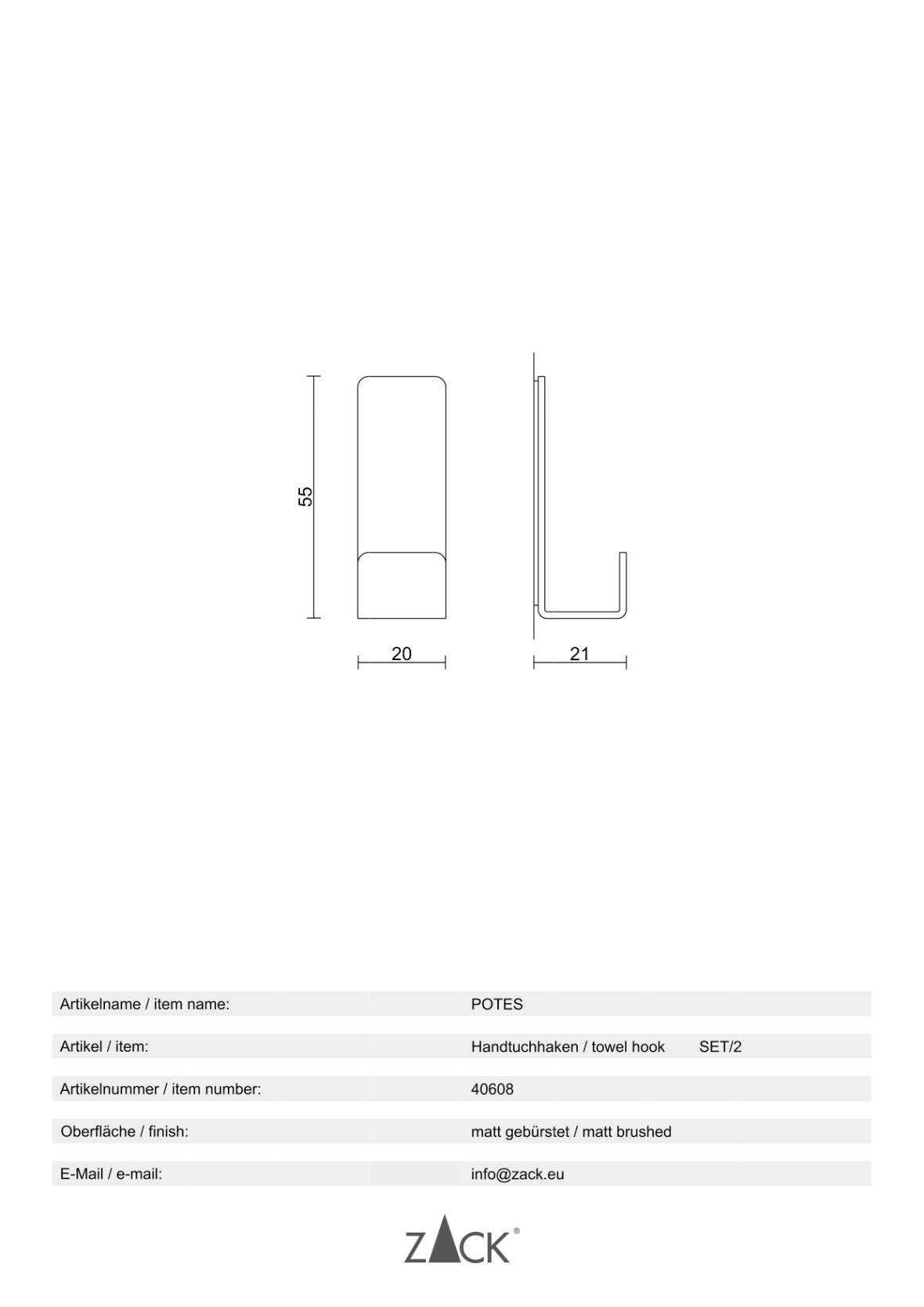 Productinformatie "POTES" handdoekhaakje, klein, set/2, mat