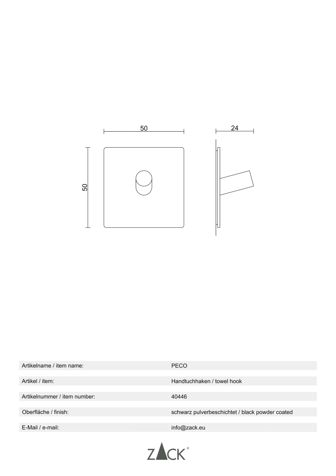 "PECO" handdoekhaak vierkant,5 cm, zwart