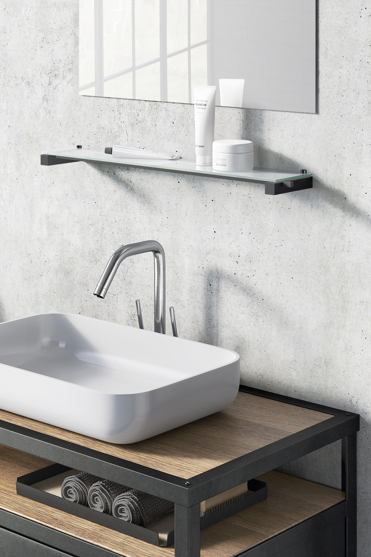 Het aan de wand bevestigde badkamerrek biedt voldoende ruimte voor verzorgingsproducten en badkamerbenodigdheden.