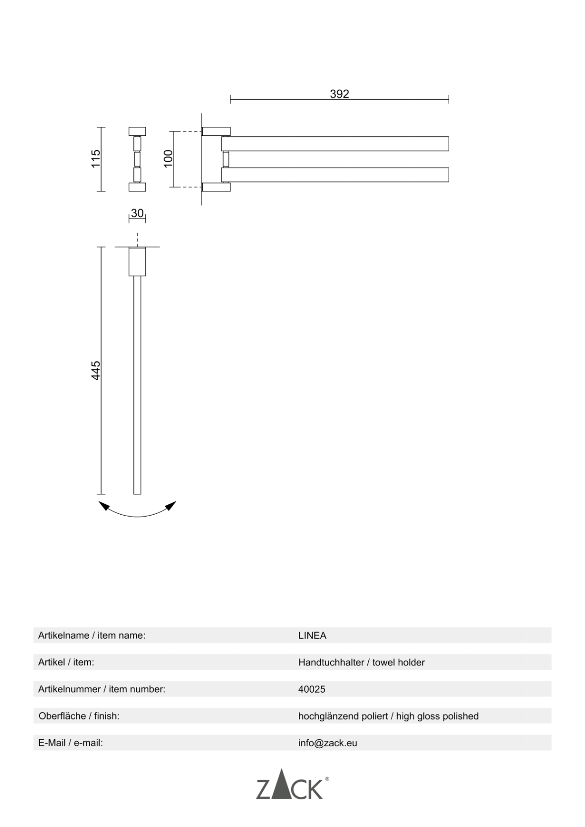 Productinformatie “LINEA” handdoekrek, draaibaar