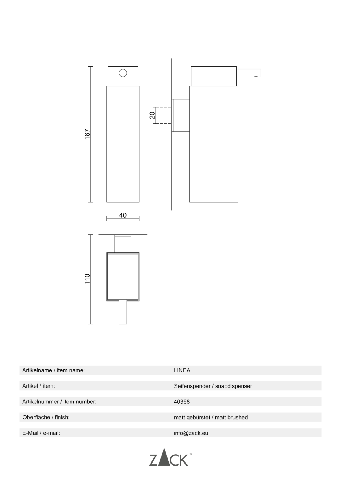 "LINEA" zeepdispenser, mat geborsteld, wandmontage