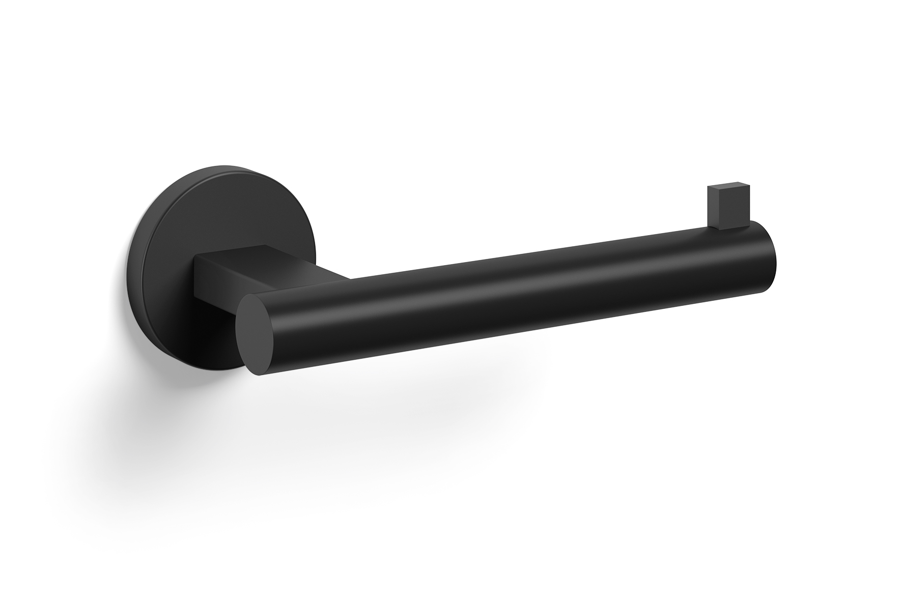 Toiletrolhouder van zwart gepoedercoat roestvrij staal van Zack, naar keuze verkrijgbaar met schroef- of kleefbevestiging.
