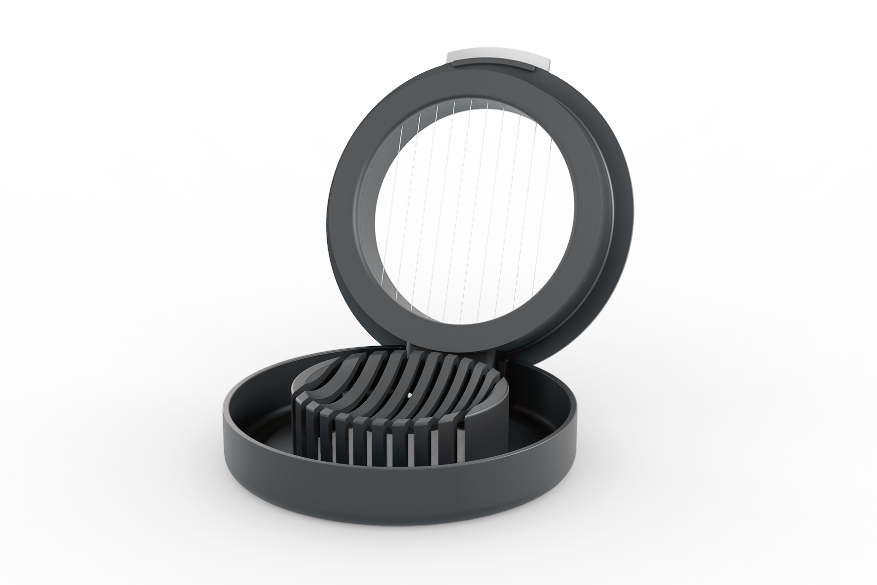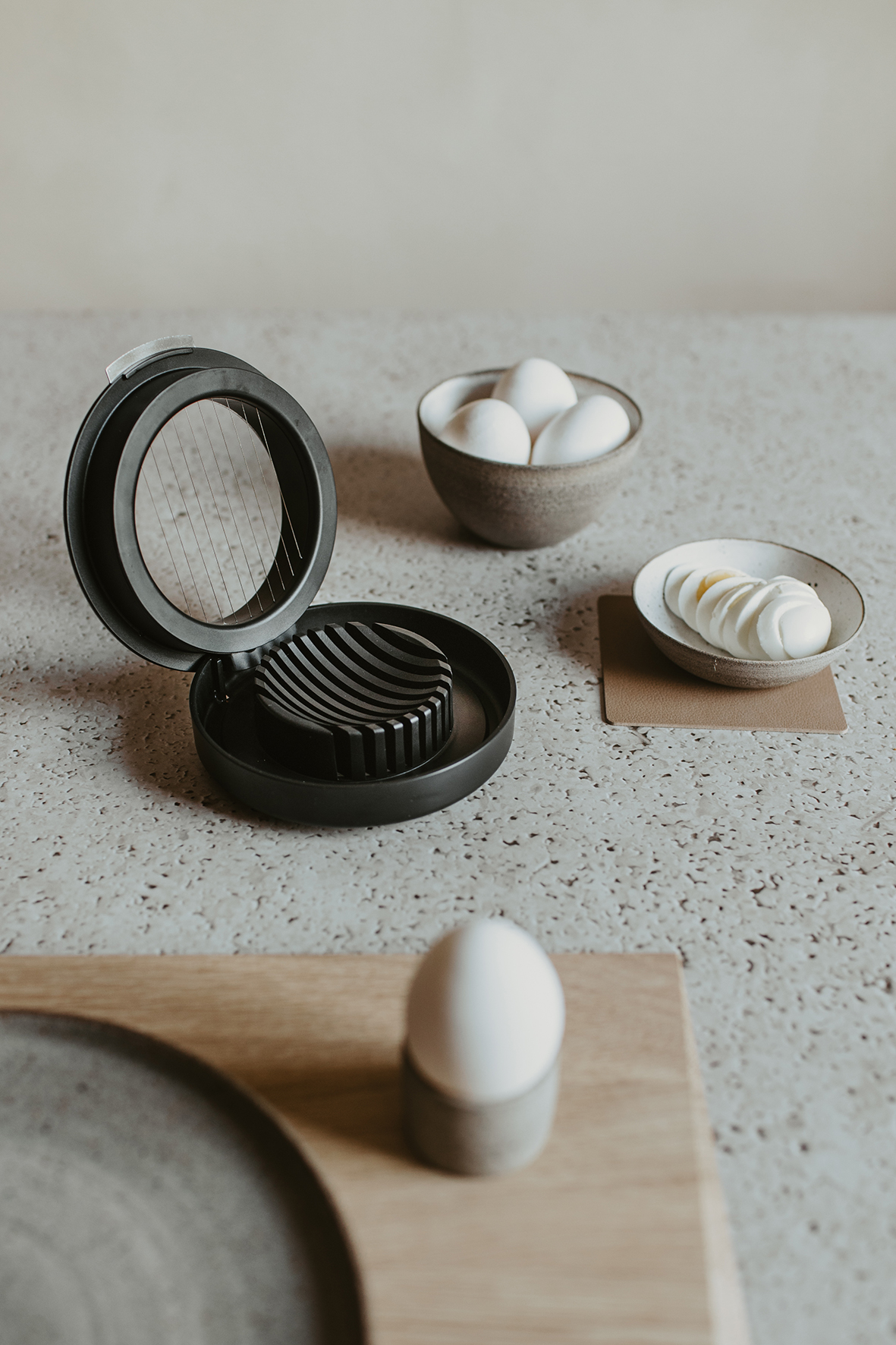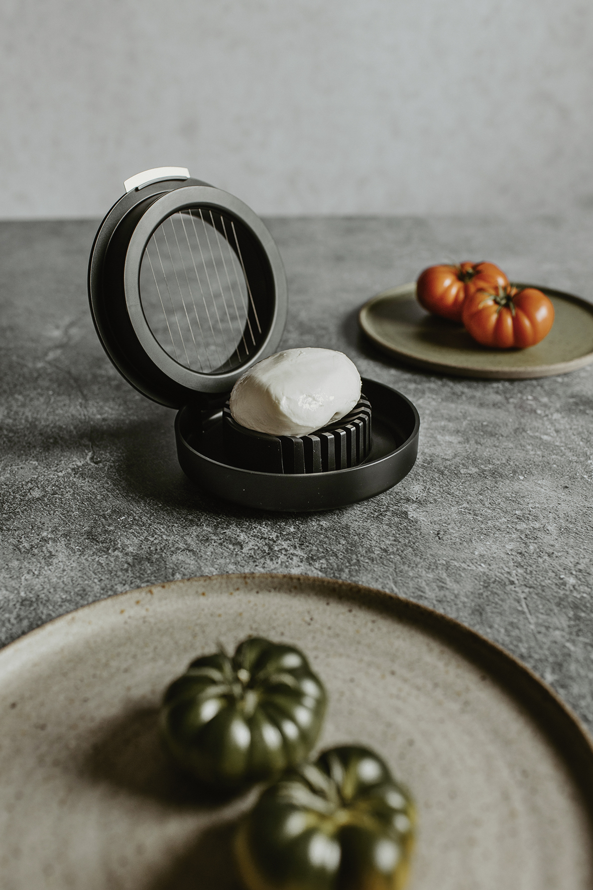 Elegant keukenhulpje in modern ZACK design gemaakt van mat zwart kunststof met een satijn geborsteld roestvrij stalen inzetstuk. De roestvrijstalen draden snijden hardgekookte eieren, mozzarellakaas en ander zacht voedsel snel, schoon en met weinig moeite in gelijkmatig dikke plakken.