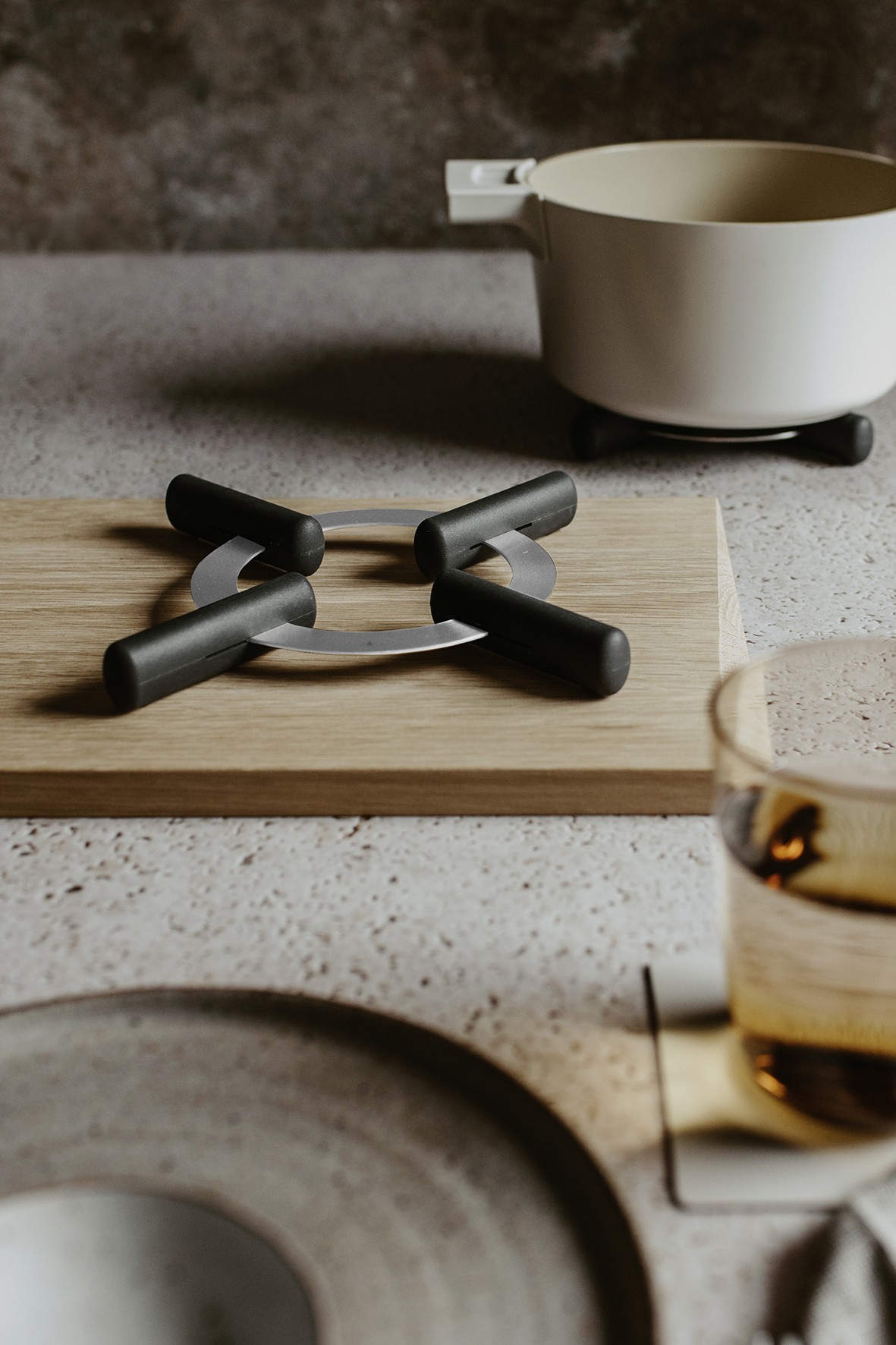 De 4 kunststof armen kunnen naar wens worden uitgeschoven (20-24 cm) en beschermen de tafel tegen de restwarmte van de pan.