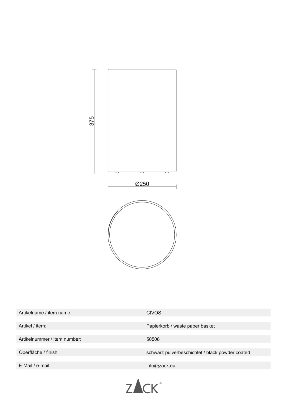 Productinformatie "CIVOS" prullenmand, zwart